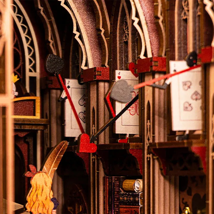 Designed with touch control LED lights, this book nook illuminates the intricate details, making it a perfect addition to any collection. The kit’s precise seating and tongue-and-groove construction ensure a stress-relieving assembly experience, bringing the magical courtroom of Alice’s adventures to life.